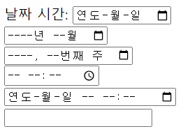 - type="datetime" → 문법에는 존재하나, 현재 대부분의 브라우저가 이 기능을 구현하지 않음.