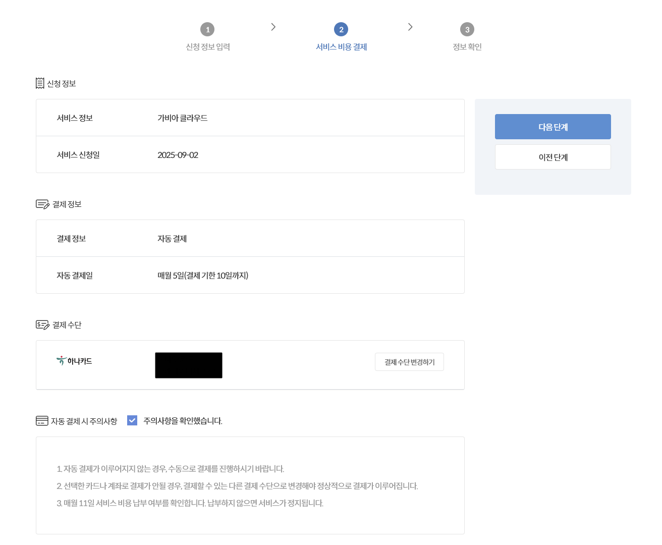 위 과정까지 모두 끝나면 서버 신청을 위한 가비아 클라우드 이용 신청이 모두 완료된 상태이다.