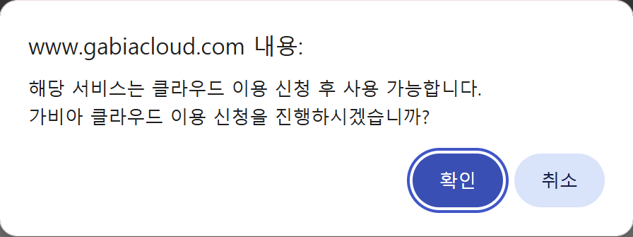3. '신청하기' 버튼 클릭 시, 아래와 같이 alert이 뜬다. 확인을 클릭하여 가비아 클라우드 이용 신청을 진행한다.