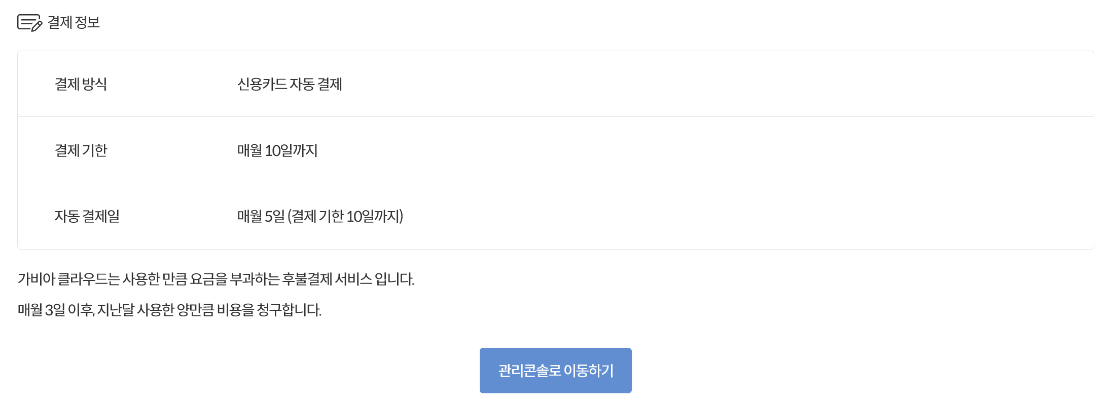 서버 생성, 공인 IP 생성, 도메인 등록, 인증서 구매 등 비용이 지불될 때 위에서 등록한 결제 수단으로 결제가 진행된다.
