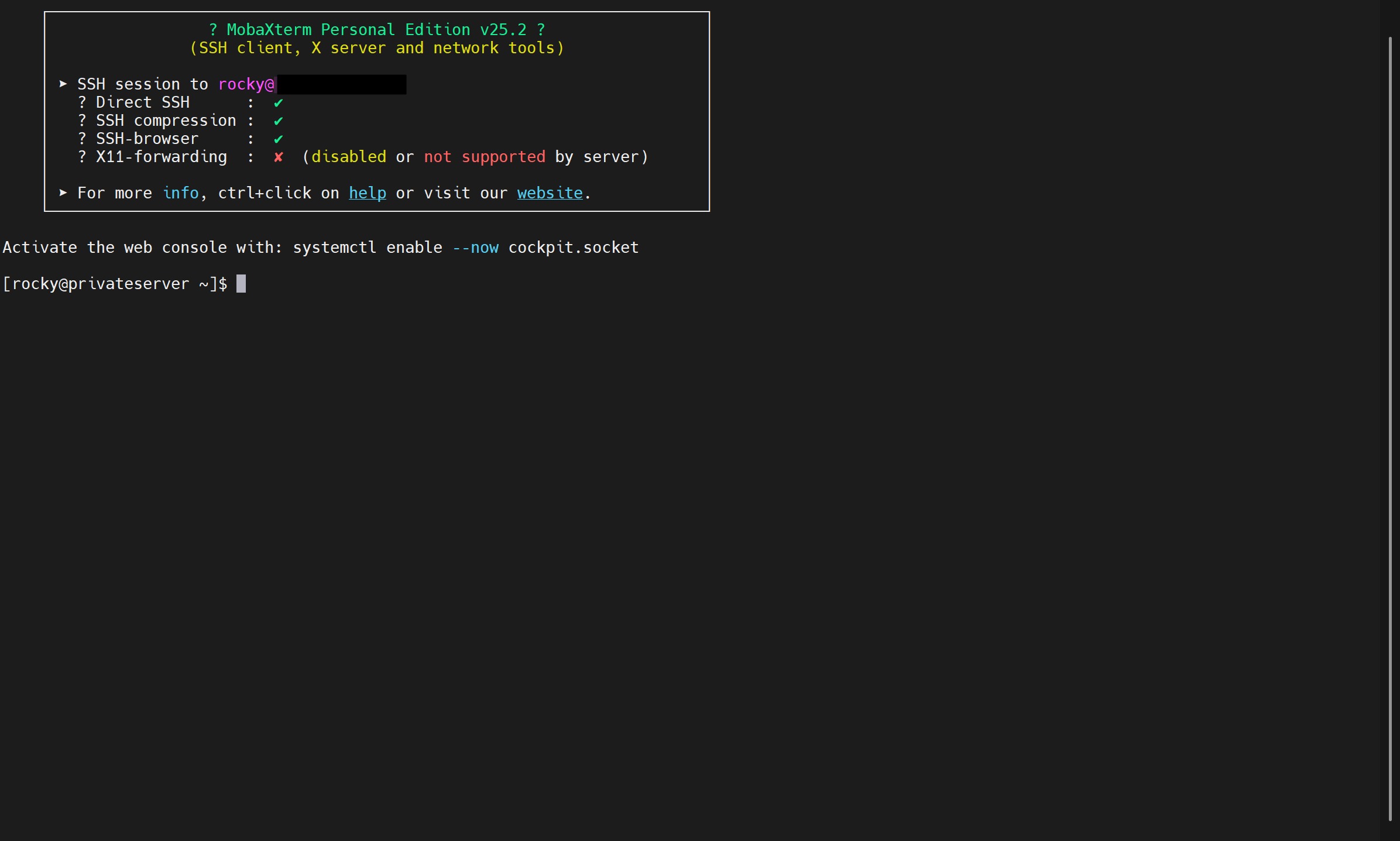 - user명 (서버 생성 화면에서 사용자 명이 rocky로 생성된 것을 확인해서 저는 rocky 입력)