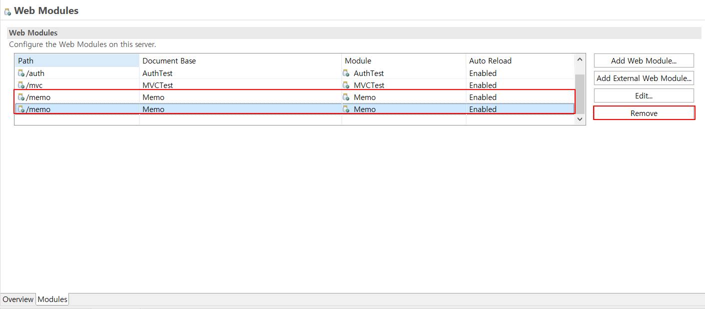 2. 하단의 Modules 선택 후, 중복된 Path 선택하여 Remove 해주기