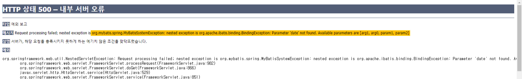 org.mybatis.spring.MyBatisSystemException: nested exception is org.apache.ibatis.binding.BindingException: Parameter 'date' not found. Available parameters are [arg1, arg0, param1, param2]
