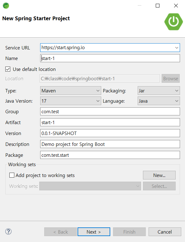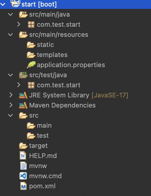 - Package: com.test.start (→ 루트 패키지. Group + Artifact 조합한 패키지명.)