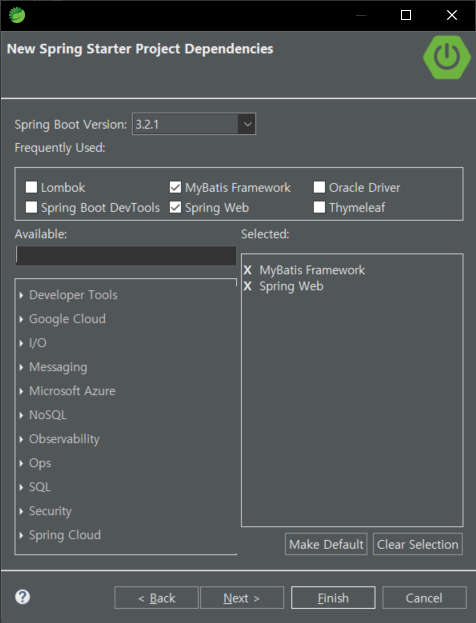 - MyBatis Framework: 선택 시, 자동으로 관련 dependency가 설치되서 pom.xml을 열 필요가 없다.