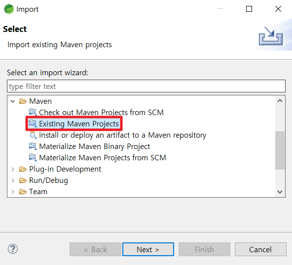 4. STS4로 돌아와서, File → Import → Maven → Existing Maven Projects 선택 후 Next