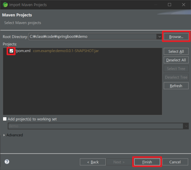 5. Browse 선택 후, 압축 푼 폴더 경로 안으로 들어가서 폴더 선택 후, xml파일 체크 하여 Finish