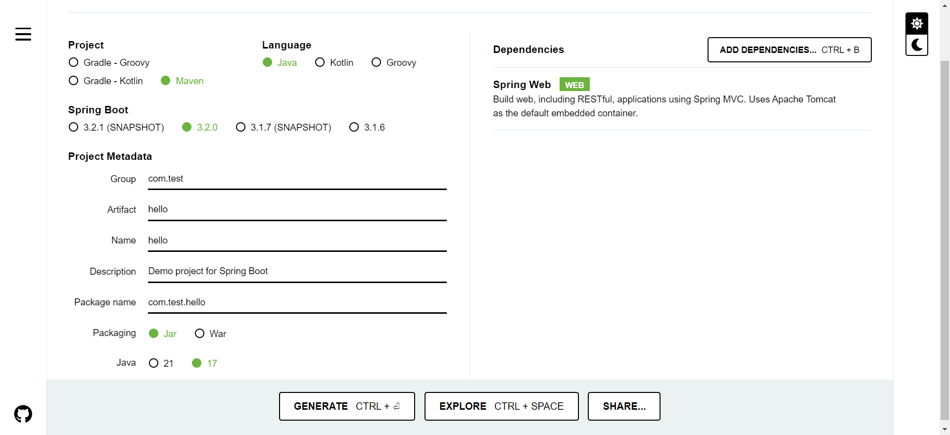 2. STS를 사용해서 프로젝트를 생성했을 때와 거의 유사한 화면이 나타난다. 아래 사진과 같이 입력하고 , Dependencies 선택 후 GENERATE 클릭