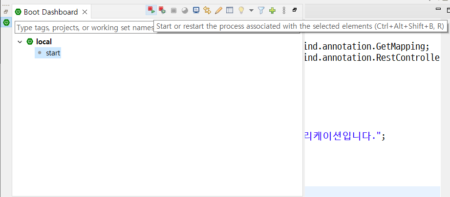 1. 왼쪽 하단 Boot Dashboard → 프로젝트 선택하여 Start 버튼 클릭 (권장)