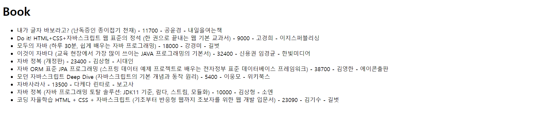 <li>${dto.title} - ${dto.discount} - ${dto.author} - ${dto.publisher}</li>