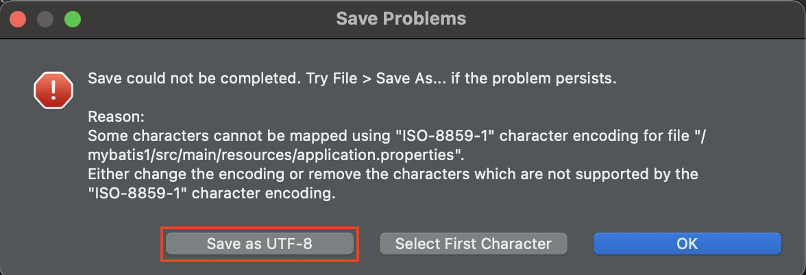 프로젝트 생성 후, 처음 application.properties 파일을 수정할 경우 아래와 같은 팝업이 표출되는데 UTF-8로 저장을 선택하면 된다.