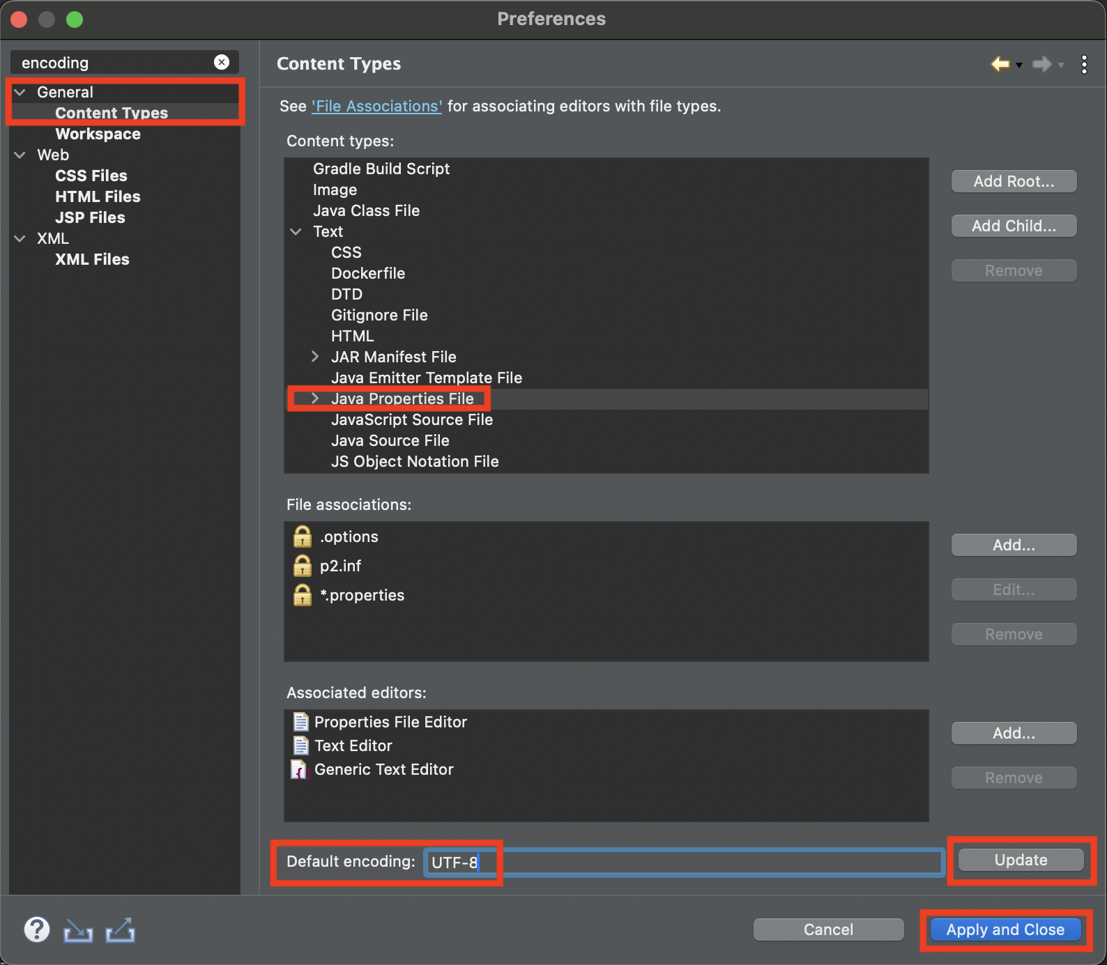 3. Settings → General → Content Types → Text 화살표 클릭 → Java Properties File → 하단 Default encoding: UTF-8로 변경