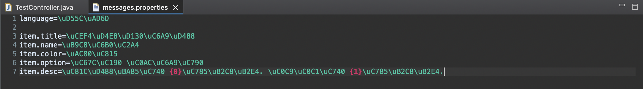 만약 인코딩 설정을 바꾸지 않고 properties 파일에 한국어 입력 시 아래 사진과 같이 한글이 보이지 않는 현상이 발생한다. 그러므로 인코딩 설정을 UTF-8로 먼저 설정하고 진행해주자!