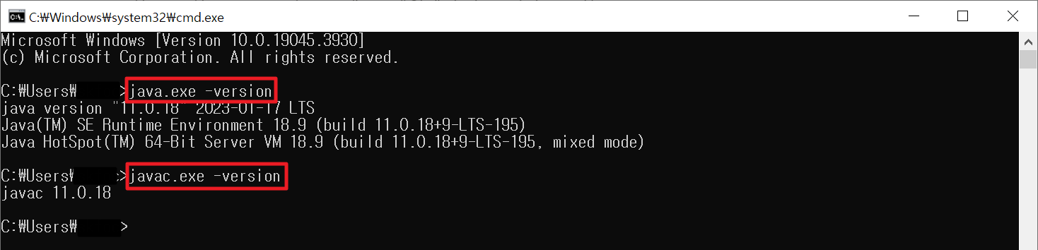 아래와 같이 입력하면 설치된 java.exe와 javac.exe의 버전이 나오며 정상 설치됨을 확인할 수 있다.