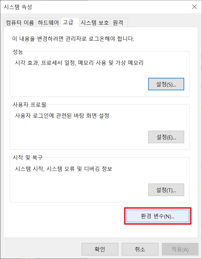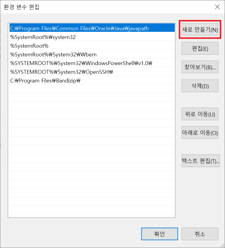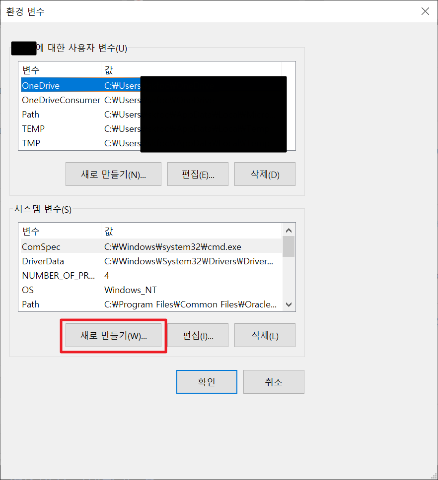 6) 다시 환경 변수의 새로만들기 창으로 돌아와서 변수 등록