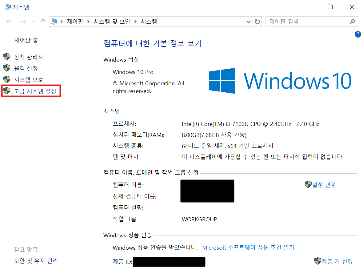 1) 탐색기 내 컴퓨터(내 PC) 우클릭 → 속성