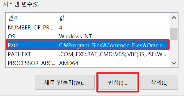 1) 환경 변수까지 들어가는 부분은 위 1번 과정과 동일하다. 시스템 변수 → Path 더블 클릭 or 편집 클릭