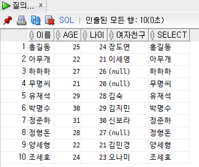 SELECT name AS 이름, age, age-1 AS 나이, couple AS 여자친구, name "SELECT" FROM tblMen;