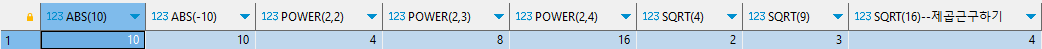 power(2, 2), power(2, 3), power(2, 4), -- 제곱 구하기