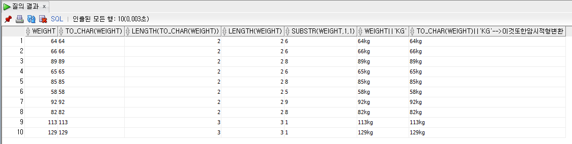 substr(weight, 1, 1), -- > 이것도 암시적 형변환 해줌!