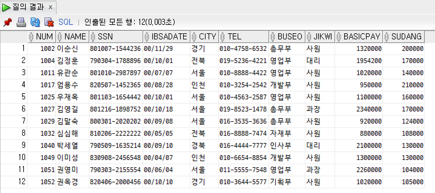 WHERE ibsadate >= '2000-01-01 00:00:00' AND ibsadate <= '2000-12-31'; -- 오답 > 2000-12-31 00:00:00 까지라 실제는 2000-12-31 23:59:59 까지가 되어야 함!!!